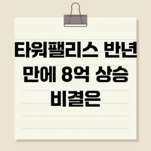 부동산 전문가 의견: 부동산 전문가들은 타워팰리스의 가격 상승 요인으로 “강남 부동산 시장의 회복세, 고급 주거 시설에 대한 수요 증가, 그리고 타워팰리스의 희소성”을 꼽았습니다.